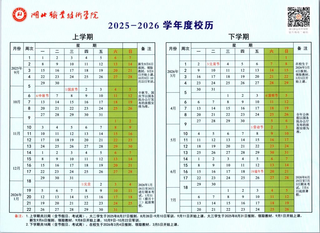 湖北职业技术学院2025-2026学年度校历