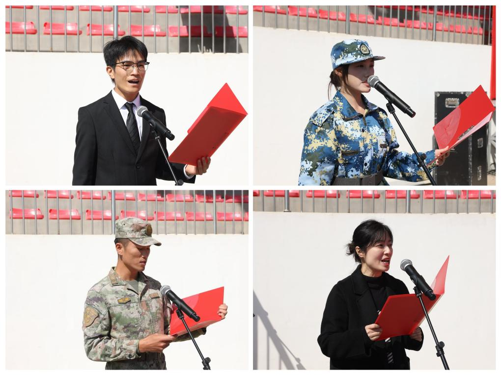 活动以雄壮的《中华人民共和国国歌》开篇,五星红旗冉冉升起,全体人员肃立行注目礼。随后军训成果汇报展开,70个新生方队依指令依次入场,身着迷彩服的新生迈着铿锵步伐、喊着洪亮口号,动作整齐划一,尽显军训成效与青春朝气。分列式后,特色表演方队登场:军体拳方队出拳如风、踢腿如雷;匕首操方队身形灵动,劈刺精准;刺杀操方队气势如虹,持枪突刺连贯有力,精彩表现赢得全场掌声。