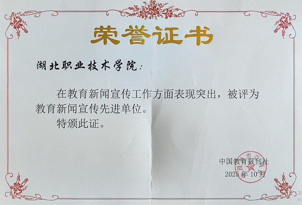 (本网讯 唐熙隆)近日,中国教育报社表彰了2025年全国高校教育新闻宣传先进单位和个人,中国教育报刊社副社长吕同舟等出席并颁奖。湖北职院获评中国教育报社教育新闻宣传先进单位,陈灏同志获评中国教育报社2025年度优秀通讯员。