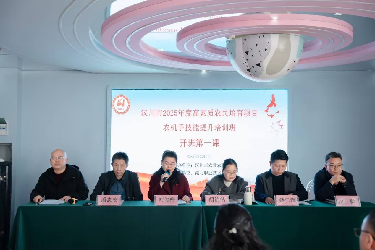 (本网讯 叶潘)12月1日上午,汉川市2025年度高素质农民培育项目农机手技能提升培训班在汉川开班。本次培训由汉川市农业农村局主办,我校信息工程学院承办。汉川市农业农村局二级主任科员胡锦绣、刘俊梅,农机技术推广中心主任聂仁锋,继续教育学院副院长汪向东,信息工程学院院长潘志安、党总支书记段毅、副院长吴春花等出席活动。活动由汪向东主持。