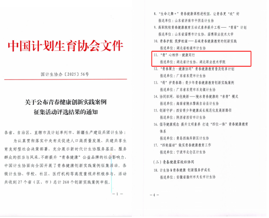 (本网讯 胡敏 朱素平)近日,中国计划生育协会公布全国青春健康创新实践案例征集活动评选结果,我校报送的《“青”心相伴・健康同行》工作案例,凭借创新驱动的工作理念、扎实显著的实践成效与可复制可推广的应用价值,成功获评优秀案例。本次评选活动严格遵循市级择优推荐、省级严谨初审、中国计生协复审核实的三级评审流程,围绕案例真实性、创新性、时效性、引领性、可推广性五大核心维度综合考评。最终全国范围内评定优秀案例30个,其中高校案例仅7个,充分彰显了我校青春健康教育工作的突出成效与示范引领作用。