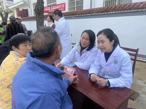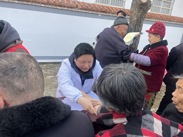 在爱心义诊区,临床医学教研室党员教师袁赟一边记录数据,一边跟村民“拉家常”:“您这血压有点高,平时咸菜要少吃啊!”,并详细讲解了高血压患者在日常生活中需要注意的事项和饮食调整技巧。