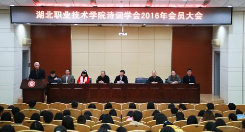 会上,常务副会长兼秘书长陈谷栋报告了诗词学会自筹建以来的工作情况,副会长程思宣读了修改后的《湖北职院诗词学会章程》,学校党委宣传部负责人曾少武宣读了诗词学会首届会长、副会长、秘书长名单,艺术与传媒学院学生代表熊峥红代表诗词学会会员发言,湖北诗词学会副会长、孝感市诗词学会会长程德华致辞并赠“名校雅风”书法作品誌贺,诗词学会会长何兴楚就诗词学会工作计划和发展思路进行了通报。