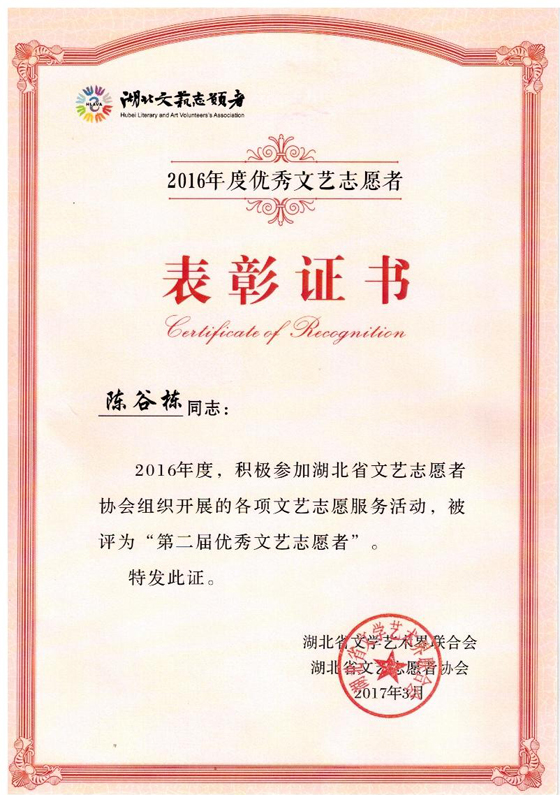 陈谷栋老师被授予“湖北省2016年度优秀文艺志愿者”荣誉称号
