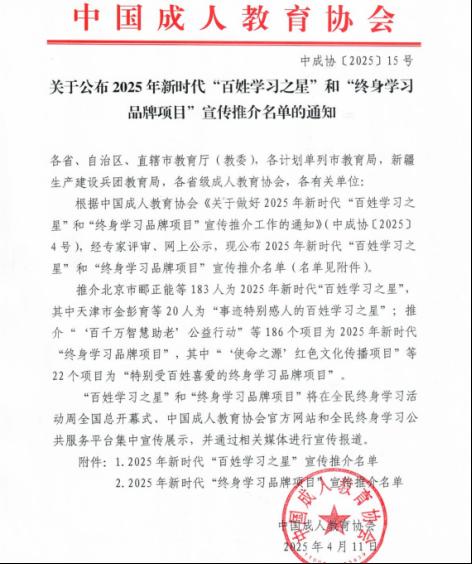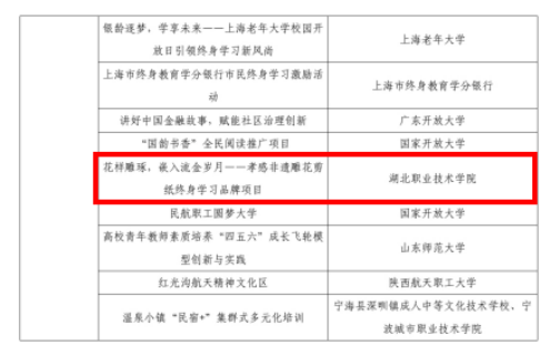 (本网讯 郁青) 4月11日,中国成人教育协会公布获奖名单。经专家评审、省级推荐、网上公示,湖北职业技术学院教育与艺术学院报送的“花样雕琢 嵌入流金岁月——孝感非遗雕花剪纸”荣获全国“终身学习品牌项目”称号。