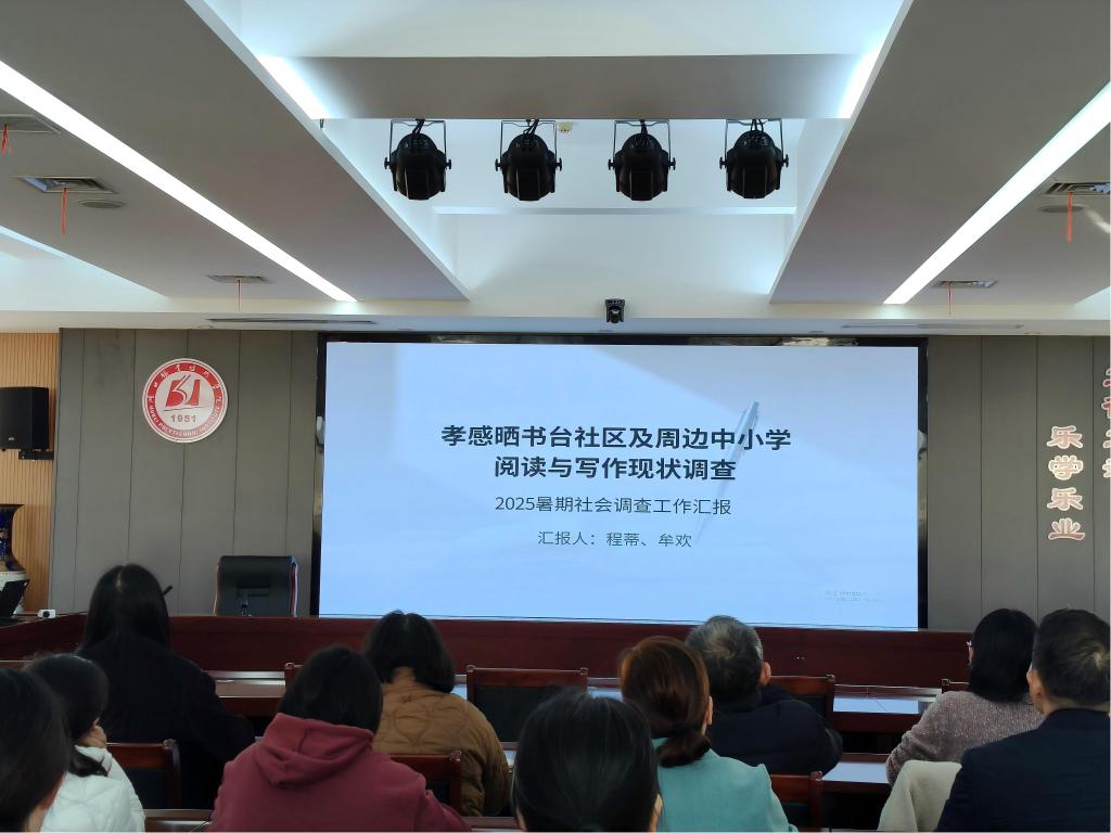 语文教研室牟欢老师汇报孝感晒书台社区周边中小学读写现状调查,指出青少年阅读时长不足、写作信心欠缺等问题,提出构建“家校社”三维读写环境、推行读写一体化课程、引入AI辅助学习等建议。