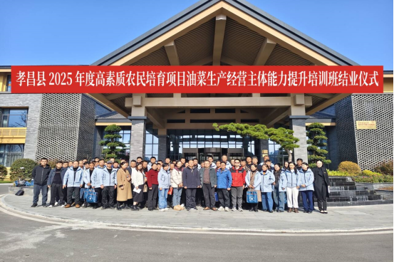 (本网讯 刘壮)11 月 24 日,由孝昌县农业农村局主办、湖北职业技术学院承办的“孝昌县 2025 年度高素质农民培育项目油菜生产经营主体能力提升培训班”结业典礼在孝昌县农夫子教育培训基地举行。孝昌县农广校校长、农业农村局科教股主任李文书、医学院党总支书记高想清、副院长王光耀及69名学员参加结业典礼。结业典礼由王光耀主持。